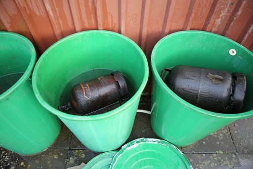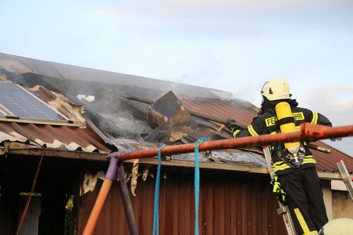 Das zuerst eintreffende Löschfahrzeug der Ortsfeuerwehr baute eine Wasserversorgung auf und begann den Löschangriff mit zwei Trupps unter Atemschutz. Insgesamt kamen vier Trupps unter Atemschutz zum Einsatz. Bedingt durch das verwendete Baumaterial musste in mühevoller Handarbeit ein Blechdach entfernt werden, um an alle Glutnester zu gelangen. Weiterhin mussten drei Popangasflaschen geborgen und gekühlt werden