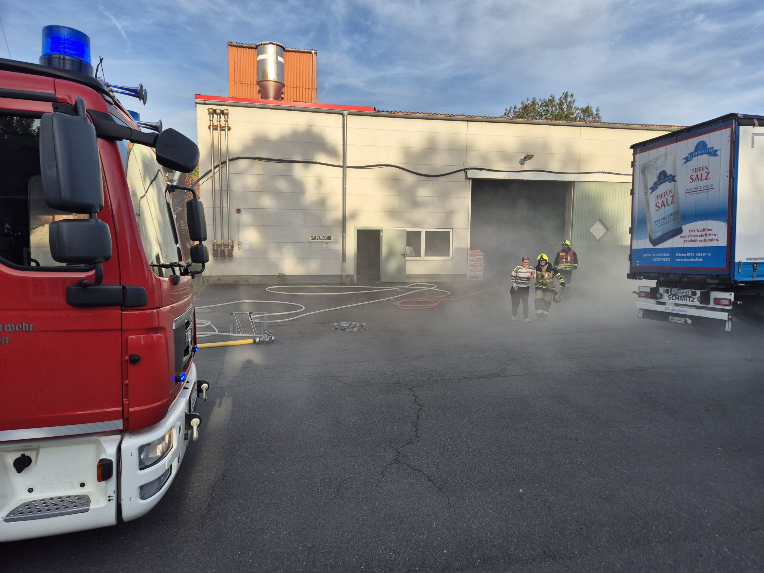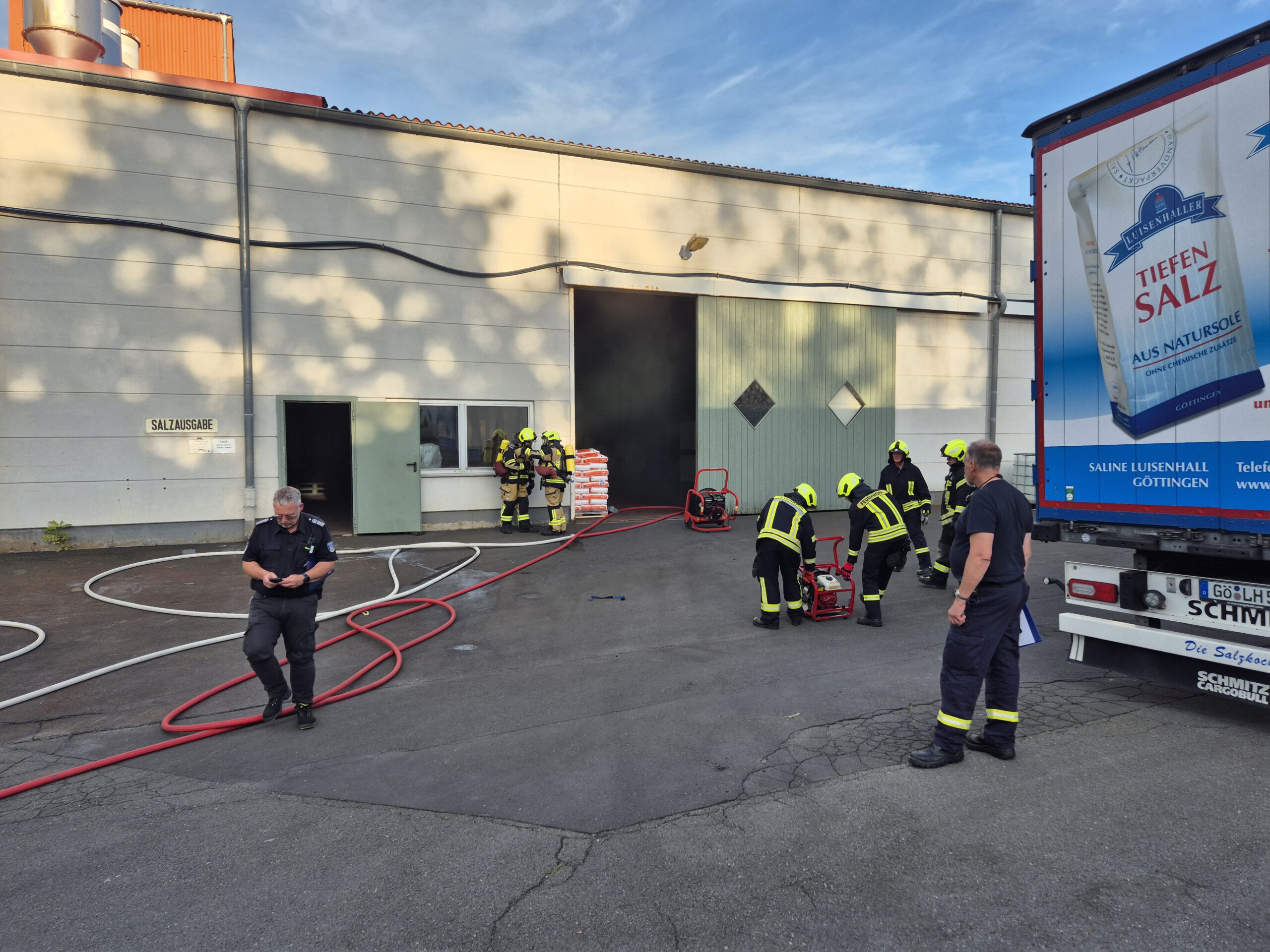 Auf dem Gelände der Saline Luisenhall fand am Freitag, den 19. September, eine Einsatzübung der Groner Feuerwehr statt. Als Ausgangslage wurde angenommen, dass in einer Produktionshalle ein Feuer ausgebrochen sei und drei Personen vermisst werden. Für die Groner Feuerwehr war dies eine Alarm-Einsatzübung, ohne dass die Mitglieder der Einsatzabteilung davon wussten.